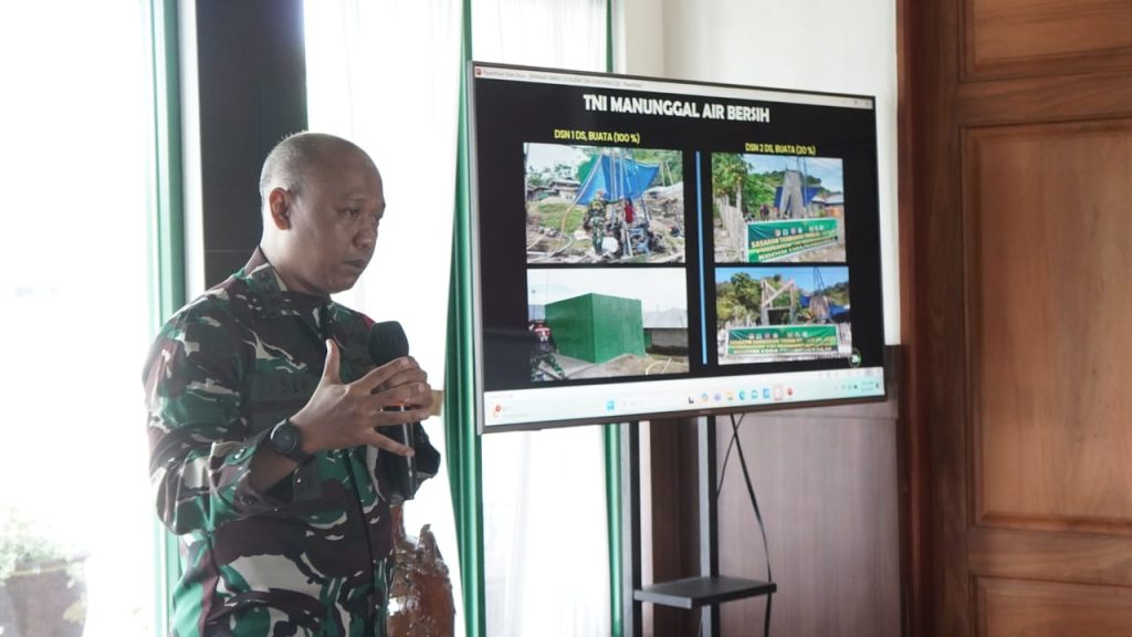 Gorontalo – Bertempat di ruang rapat Korem 133/Nani Wartabone, Jalan Trans Sulawesi, Desa Tri Dharma Kec. Pulubala, Kab. Gorontalo Komandan Kodim (Dandim) 1304/Gorontalo Kolonel Arm Asep Ridwan, S.H., M.Han yang juga bertindak sebagai Dansatgas, memaparkan perkembangan pelaksanaan Program TNI Manunggal Membangun Desa (TMMD) ke-125 TA. 2025 di wilayah Kodim 1304/Gorontalo Jumat (01/08/2025) . Program yang berlangsung di Desa Molutabu, Kecamatan Kabila Bone, Kabupaten Bone Bolango ini telah menunjukkan pencapaian signifikan, terutama dalam pembangunan rumah warga dan pembuatan Bak Air.