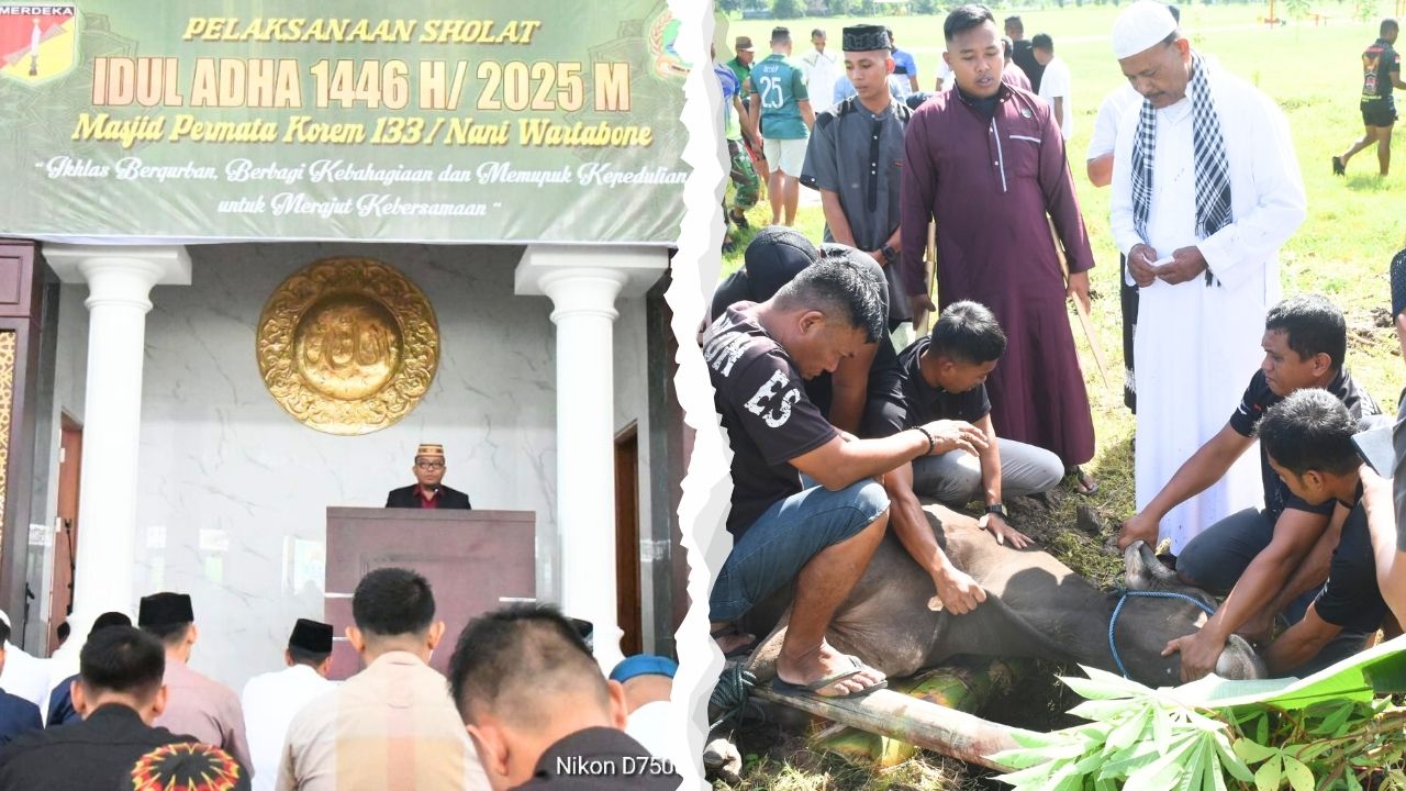 GoProinfo.com – Korem 133/Nani Wartabone menggelar Sholat Idul Adha 1446 H bersama prajurit, Persit, dan warga sekitar. Usai sholat, dilaksanakan penyembelihan 5 ekor sapi di Masjid Permata Korem, Pulubala.
