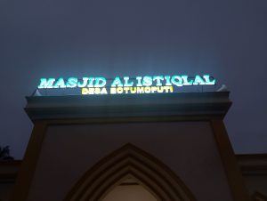 Papan nama yang bertuliskan “Masjid Al-Istiqlal” dalam warna hijau dan “Desa Botumoputi” dalam warna putih ini terbuat dari akrilik dengan lampu di dalamnya, sehingga bisa terlihat jelas pada malam hari.