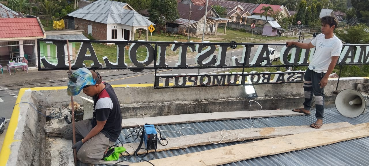 Suasana kebersamaan terlihat jelas dalam proses pemasangan ini. Warga saling membantu memastikan papan nama terpasang dengan kokoh, mencerminkan semangat gotong royong dalam menjaga fasilitas rumah ibadah di Desa Botumoputi.