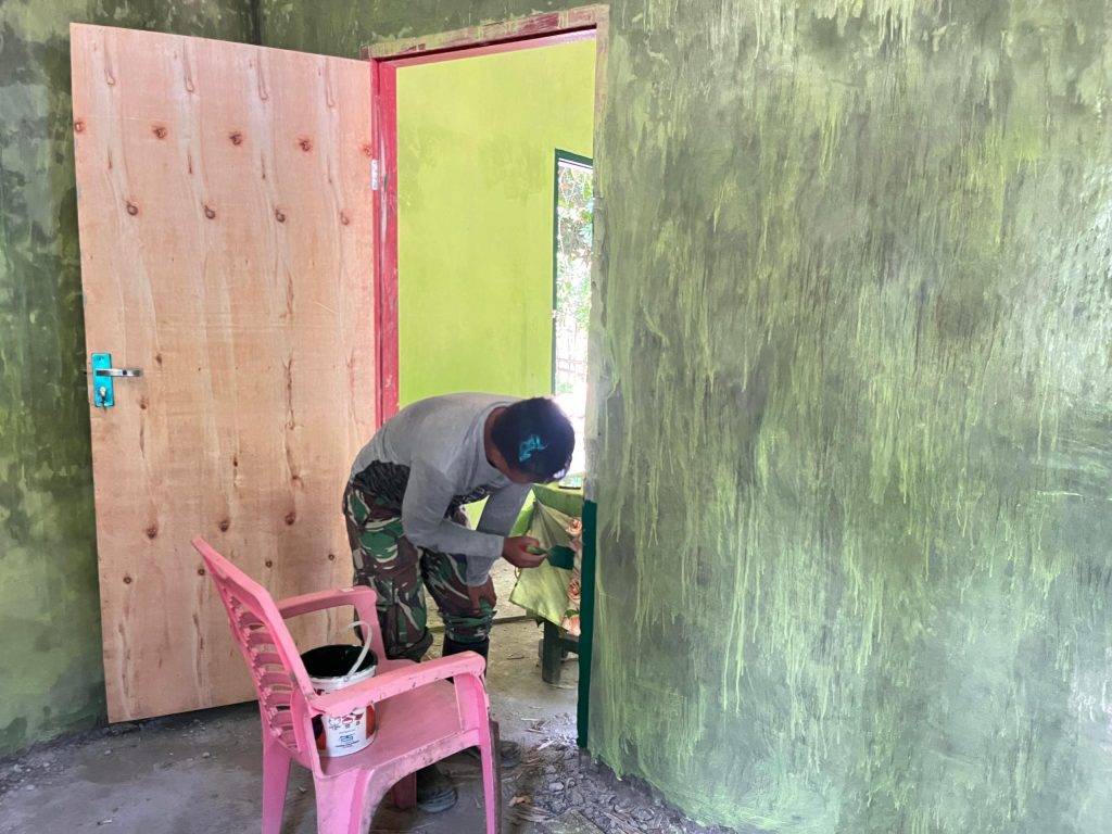 Gorontalo – Personel Satgas TMMD ke-125 Kodim 1304/Gorontalo terlihat samangat mengecat dinding Rumah Tidak Layak Huni (RTLH) milik Abdul Rahman (52) di Desa Molotabu, Kecamatan Kabila Bone, Kabupaten Bone Bolango, Kamis (31/07/2025).